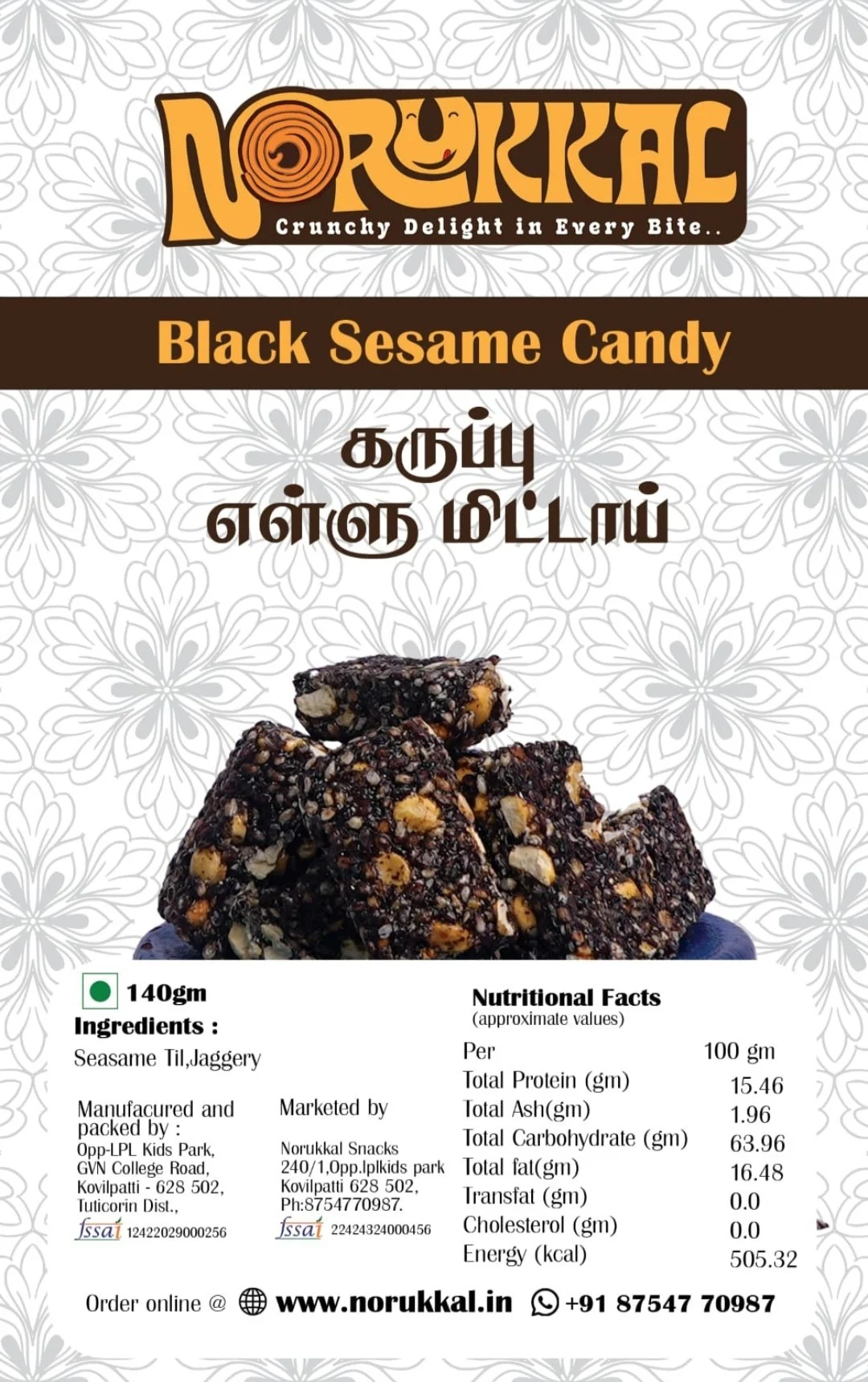 Norukkal Black Sesame Candy (கருப்பு எள் மிட்டாய்), a traditional and nutritious Indian sweet made with black sesame seeds and jaggery.